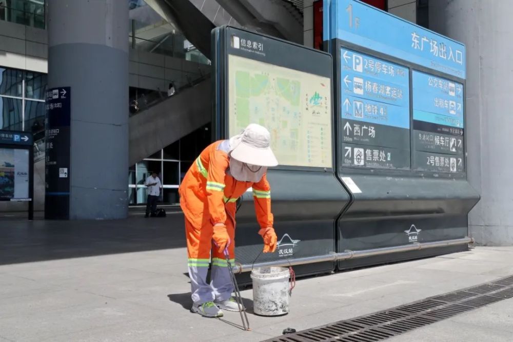 为给旅客营造整洁舒适的出行环境,综管办以东西广场、地铁19号线等区域为重点,延伸至售票厅、出站口等部位,加大清扫力度。白天重点清洗人行道、公交站台,精细化保洁的士候乘区;夜间进一步提升清洗强度。同时,增加垃圾清运频次,加强垃圾分类巡检,发放宣传手册,引导旅客和商户正确投放垃圾。