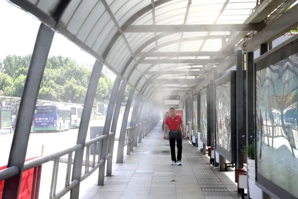 随着2025年铁路暑期运输工作正式启动,武汉火车站日均往返客流攀升至约21万人次。在持续的高温天气下,洪山区武汉站地区综管办(以下简称“综管办”)检修维护东广场公交长廊、出租车候车区800米长的喷雾降温系统,为往来旅客带来阵阵清凉。这套系统能实时监测环境温度,根据气温自动喷雾,形成细密的水雾幕墙。