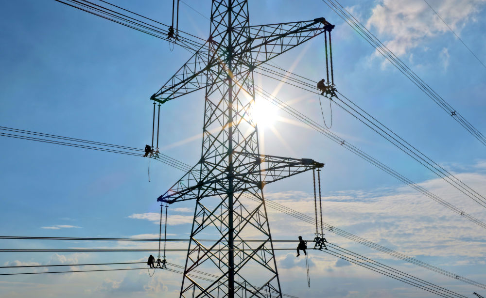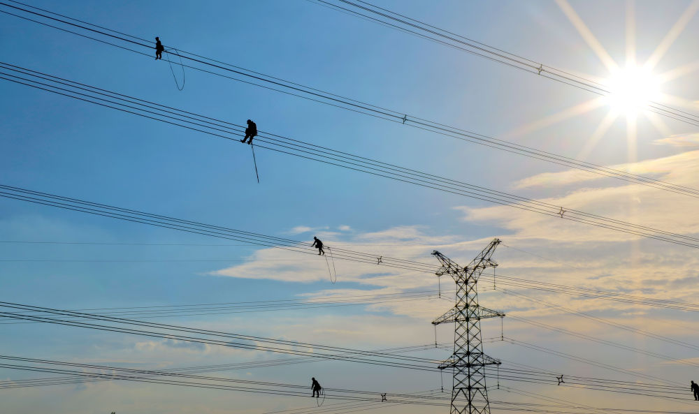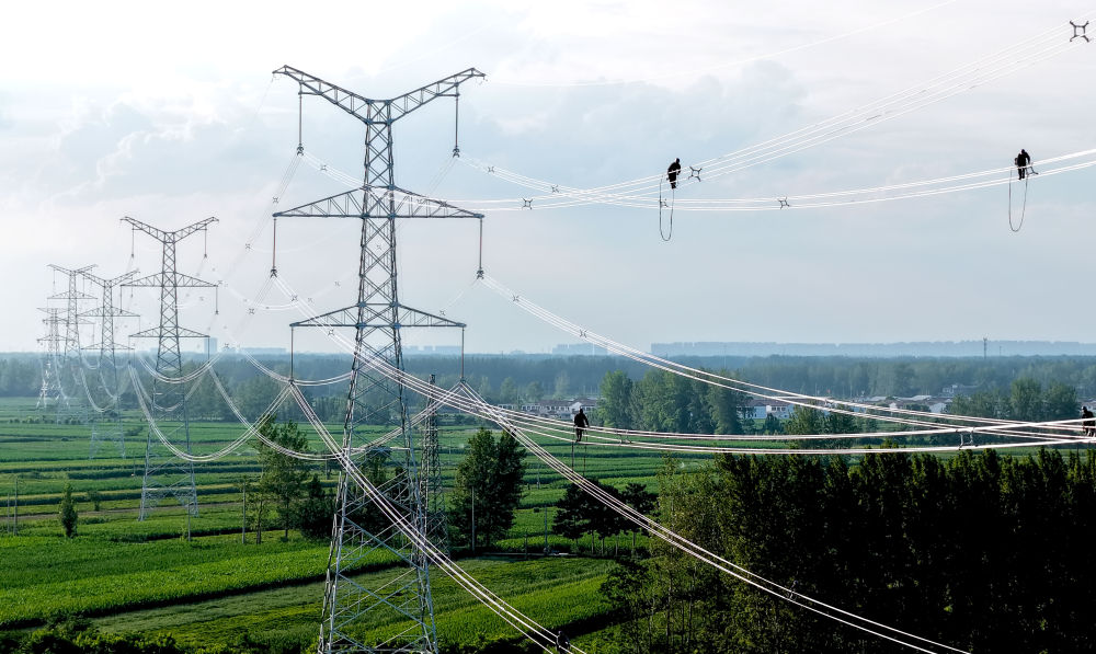 7月23日,在亳州市谯城区大杨镇贾老庄村,电力施工人员在安徽亳州伯阳-谯城500千伏线路G107-G112塔开展消缺工作。