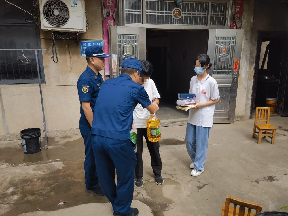 8月26日,大队教导员潘誉和消防员们再次出发,带着书籍、文具和2000元助学金,走进学生小丽的家……