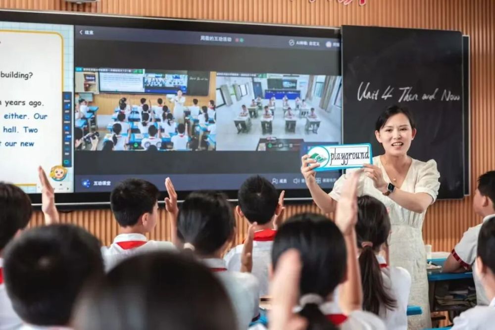 “Let's say hello to our friends from Sanping Primary School!”随着实验小学兴善校区周薇和五峰土家族自治县三坪小学田海燕老师的引导,大屏幕呈现出两地师生的课堂。本次课堂通过数字教室硬软件配合,采取AI数字人、任意问答、同屏书写、异地课堂活动PK等方式,改变了传统“双师课堂”主从班教师定位固化的状态,两地师生隔屏互动、思维碰撞,呈现了生动课堂的数字实践。