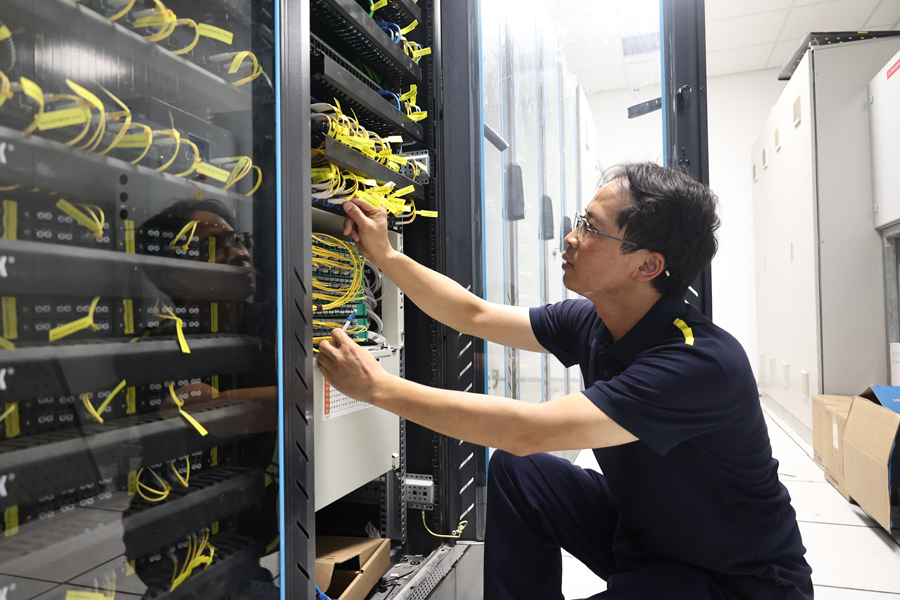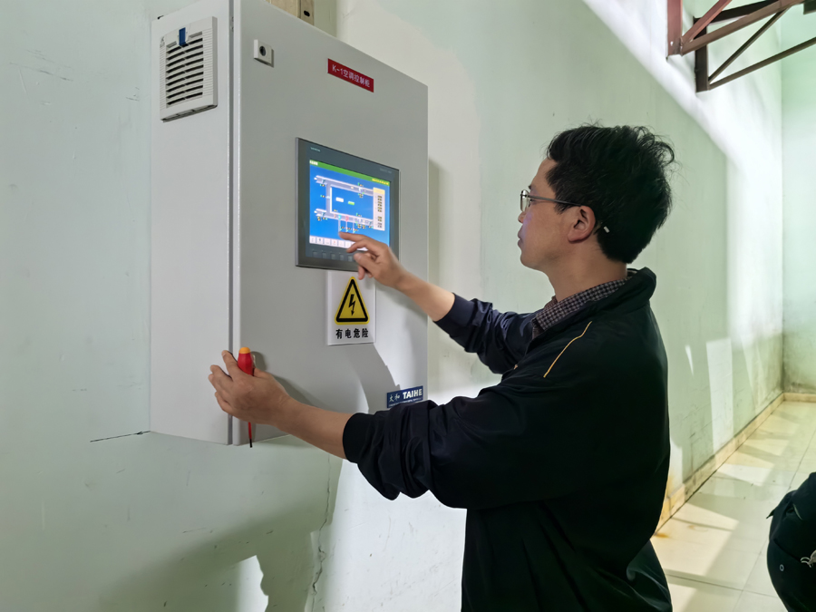 ↑王兵对组合式中央空调现场控制柜进行参数设置。