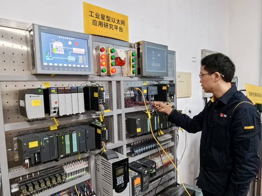 ↑“空调制冷过程中响应速度的挖掘整改”项目负责人王兵在工控实验平台对控制程序进行模拟实验。