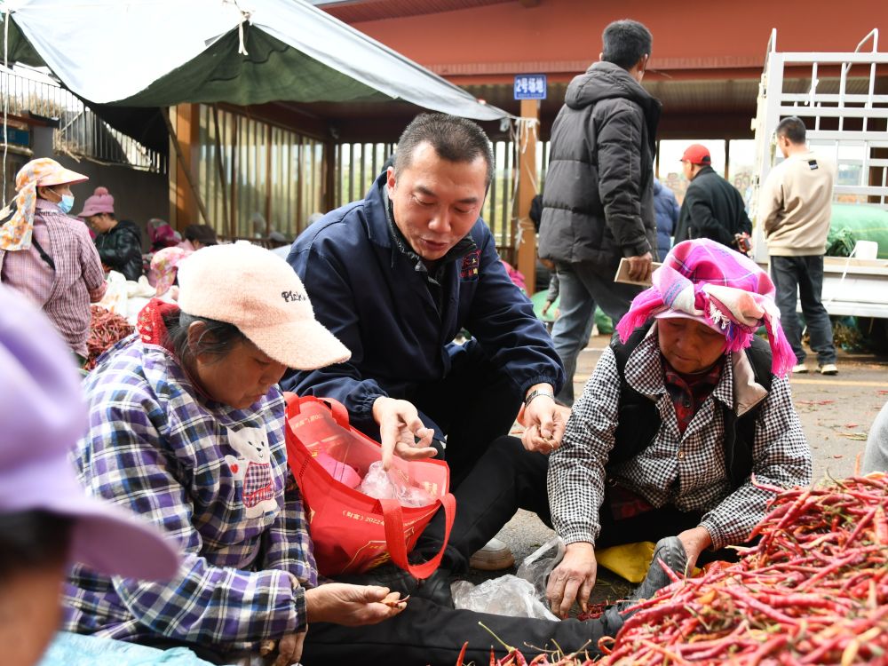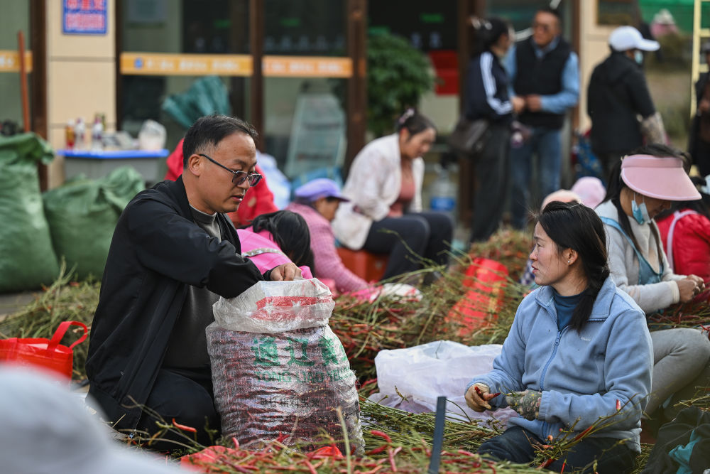 太坤调味品厂采购员入驻“零工市场”收购辣椒,指导群众辣椒分拣(2025年11月13日摄)。