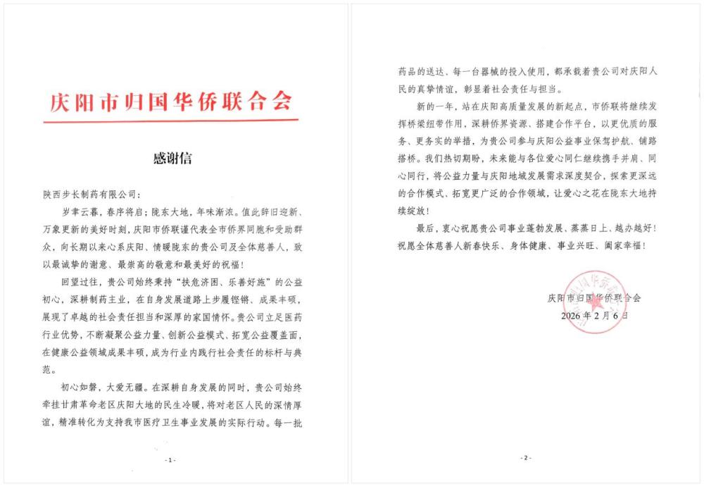 近日,庆阳市归国华侨联合会向陕西步长制药有限公司致送感谢信,代表全市侨界和受助群众对该企业长期以来的公益支持表示诚挚感谢,并向企业员工送上新春祝福。