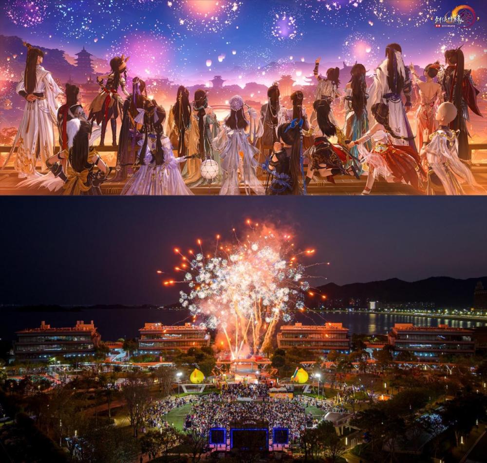图为《剑网3》游戏界面与实景活动的对比展示。西山居供图