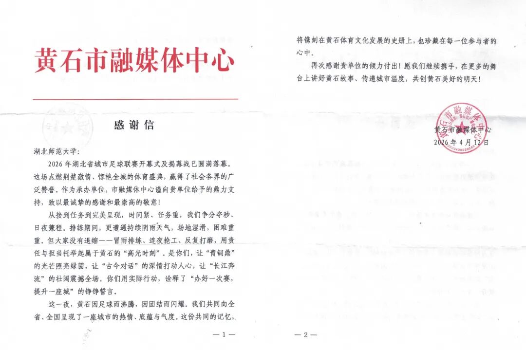 此次助力“楚超”开幕式,是我校坚持“立足黄石、服务湖北”办学理念的又一次生动实践。学校将继续深化校地合作,鼓励更多师生在更大的舞台上展现湖师风采,为黄石及湖北高质量发展贡献湖师力量。