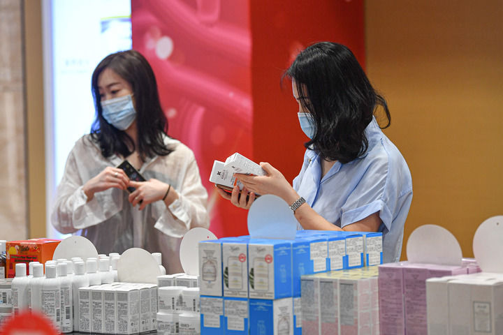 ↑消费者在海口日月广场免税店选购商品(4月19日摄)。 新华社记者 蒲晓旭摄