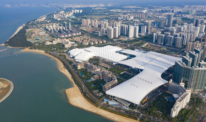 ↑这是4月30日拍摄的首届消博会举办地海南国际会展中心(无人机照片)。新华社记者 郭程 摄