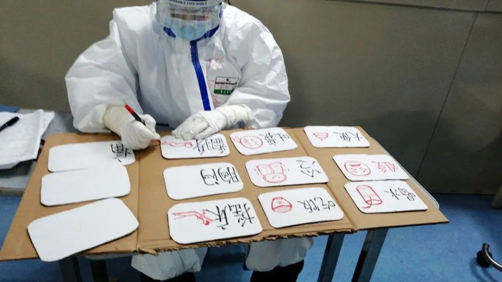 在武汉市第五医院重症病区,江西省人民医院第一批援助武汉的护士陈钰浠制作“图解护理需求表”,以方便医患双方的交流。