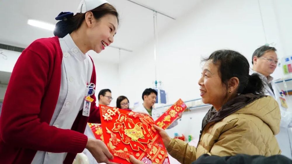 2020年1月31日,在江西省人民医院肿瘤科,医护人员为住院患者及家属送上新春祝福 彭昭之/摄