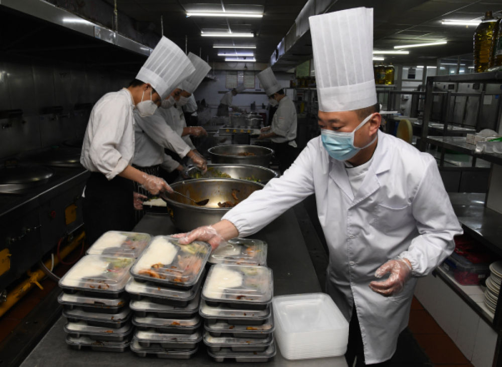 为避免扎堆聚餐,青岛一餐饮企业后厨工作人员在制作团体订餐的盒饭 李紫恒 摄