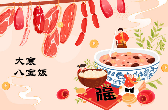 大寒饮食,应以温补类食物为主。因为“大寒”与之后的“立春”相交接,饮食上也要考虑到季节变换。可以喝点热粥、热馒头等宜消化的软食,而不宜吃凉饭、硬饼等食物。太早吃寒冷的食物,会让肠胃感觉不适,甚至上吐下泻。