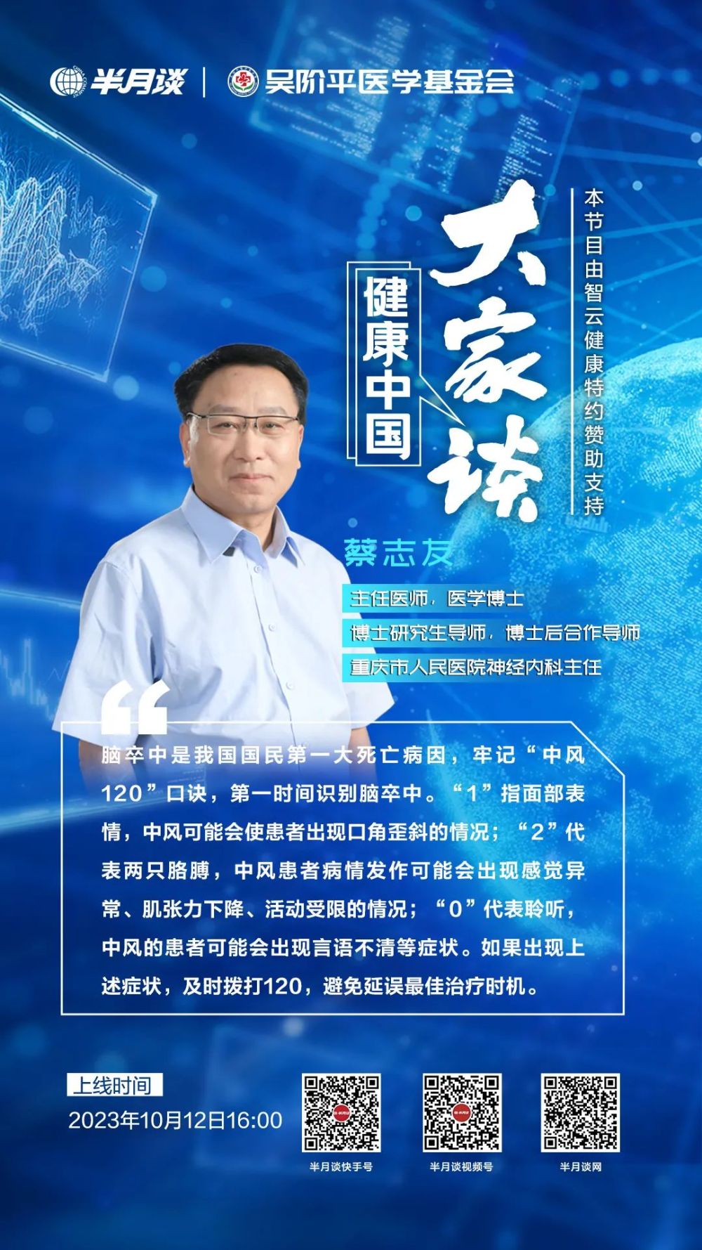 除帕金森病外,蔡志友主任还介绍了另一种神经系统疾病——脑卒中。脑卒中又称急性脑血管病或中风,是我国国民第一大死亡病因,脑细胞缺血4分钟就会死亡,大脑缺氧10秒钟就会失去意识。“时间就是大脑”,牢记“中风120”口诀,有助于快速识别脑卒中。“1”是指面部表情,中风可能会使患者出现口角歪斜的情况;“2”代表两只胳膊,中风患者病情发作可能会出现感觉异常、肌张力下降、活动受限的情况;“0”代表聆听,中风的患者可能会出现言语不清等症状。如果出现上述症状,要及时拨打120电话,避免延误最佳治疗时机。