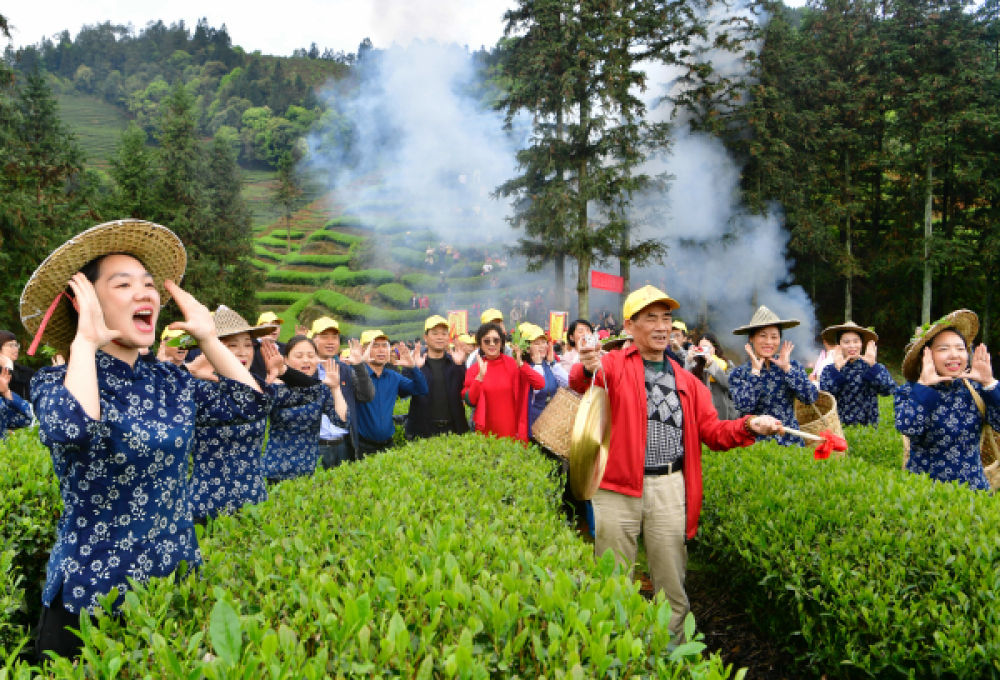 在武夷山星村镇朝阳村生态茶园,采茶女和宾客参加“祭茶喊山”仪式