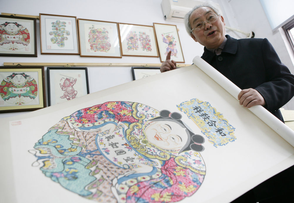 桃花坞年画大师王祖德正在展示“雍正版”《一团和气》