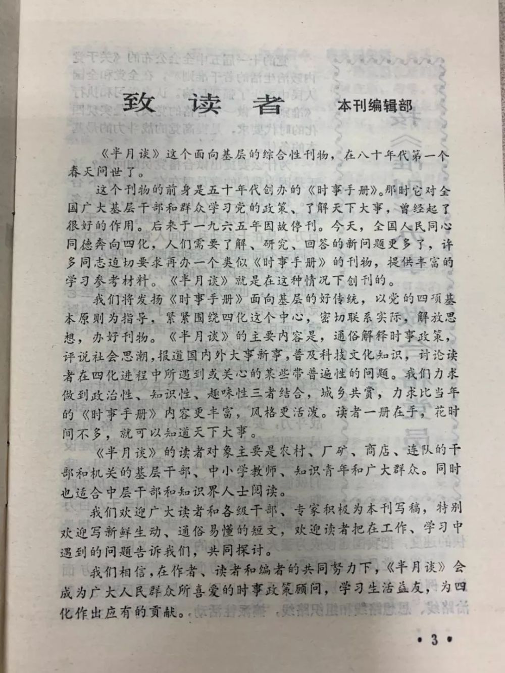 代表官方、不打官腔,时事政策顾问、学习生活益友,这是半月谈的特色,也是半月谈的初心。仍记得半月谈创刊“致读者”中的朴实话语:“通俗解释时事政策”,“力求做到政治性、知识性、趣味性三者结合,城乡共赏”,“一册在手,花时间不多,就可以知道天下大事”……这样的文风,不正是我们今天仍在努力追求的吗?