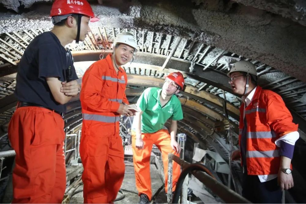 储国强(左二,现任新华社陕西分社副社长)在西安引汉济渭工程秦岭地下输水隧道采访