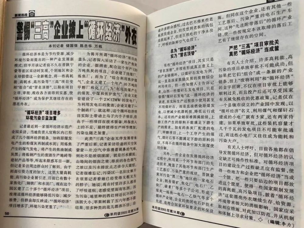 《半月谈》一直是我采写西部产业发展稿件的重要展示平台。如一些地区假借“循环经济”的名目,将高耗能、高耗水、高污染变相“组合”或“冒名顶替”,并在项目立项、审批、税收各方面得到实惠,我和山西分社记者陈忠华、内蒙古分社记者万栋采写了《警惕“三高”企业披上“循环经济”外衣》。针对能源产区出现的利益分配不均、贫富差距拉大、社会矛盾加剧等问题,我和内蒙古分社记者殷耀、四川分社记者丛峰采写了《晋陕内蒙古“金三角”贫富差距调查》。