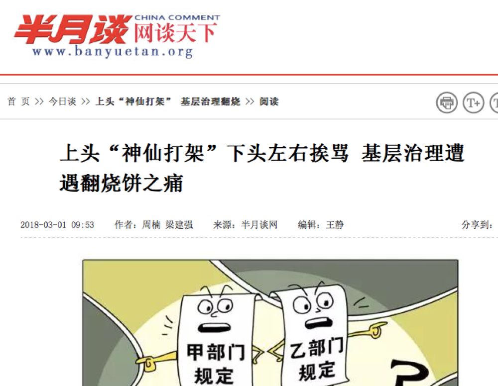 根据这些线索,我们做了深入补充采访,很快发出了《上头“神仙打架”,下头“左右挨骂”——基层治理遭遇“翻烧饼”之痛》,稿件产生了广泛影响,我朋友圈的乡镇干部纷纷转发,中国纪检监察报等30多家媒体跟进评论。接受采访的乡镇党委书记看到后马上跟我联系,说原本以为发不出来,只是基于对我的信任,以及采访的执着,才说了这些事情,没想到不仅在“中华第一刊”发出来,还产生了这么大的影响,他们很高兴当初接受了采访。