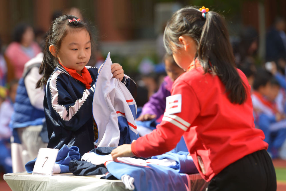 小学学生在进行叠衣服比赛 刘东岳 摄