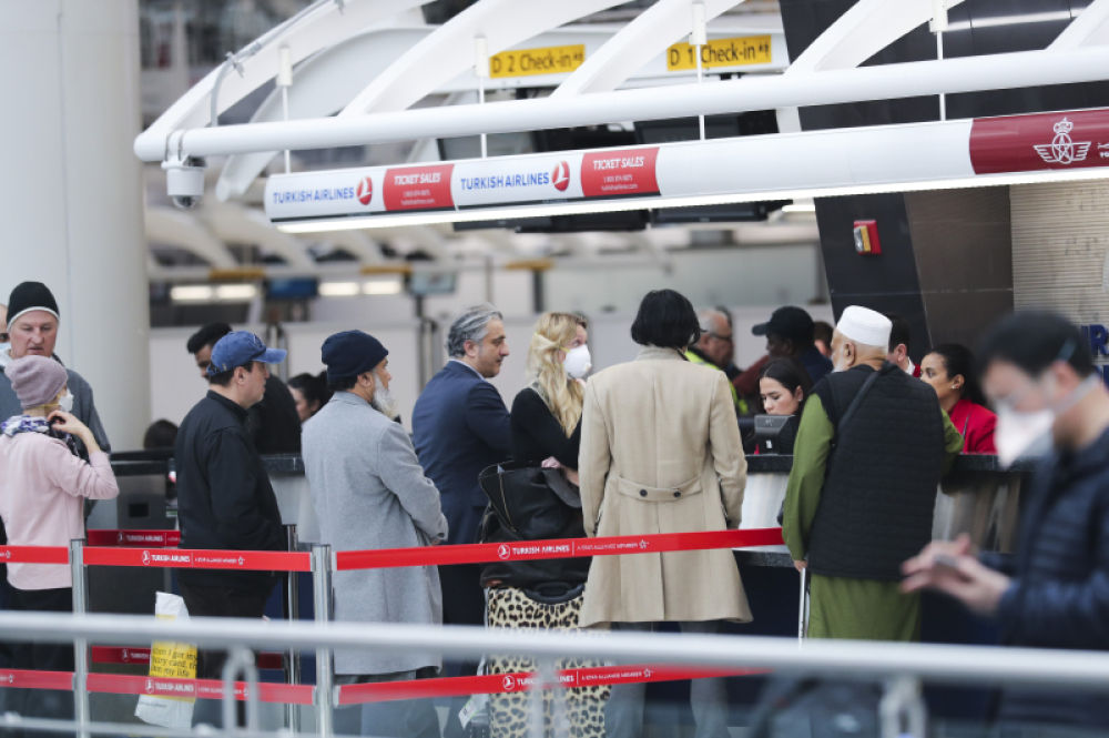 美国3月11日宣布,自3月13日午夜起暂停美国与英国以外的26个欧洲国家间人员往来。图为3月13日的美国纽约肯尼迪国际机场,旅客在办理票务手续 王迎 摄