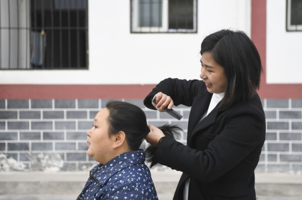 重庆奉节县草堂镇失能供养中心工作人员为失能人员梳头 王全超 摄