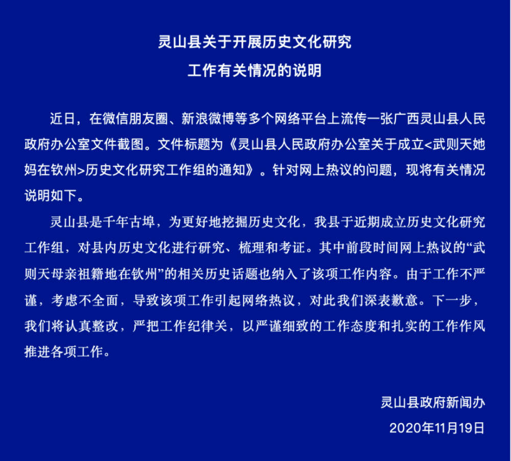 11月19日,一张标题为《灵山县人民政府办公室关于成立<武则天她妈在钦州>历史文化研究工作组的通知》的广西灵山县政府红头文件在多个网络平台上实现了刷屏。随后,灵山县政府新闻办回应:由于工作不严谨,考虑不全面,导致该项工作引起网络热议,对此我们深表歉意。
