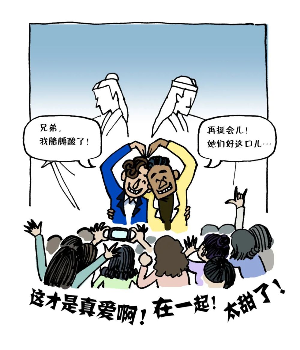 由于网剧、电视剧审查制度的存在,剧方往往会抽掉耽美原著中两位男主之间的“感情线”,在电视剧中展现“兄弟情”,通过打擦边球给观众留下想象空间,但在后续的宣发和营销过程中,两位男演员也可能“卖腐”。