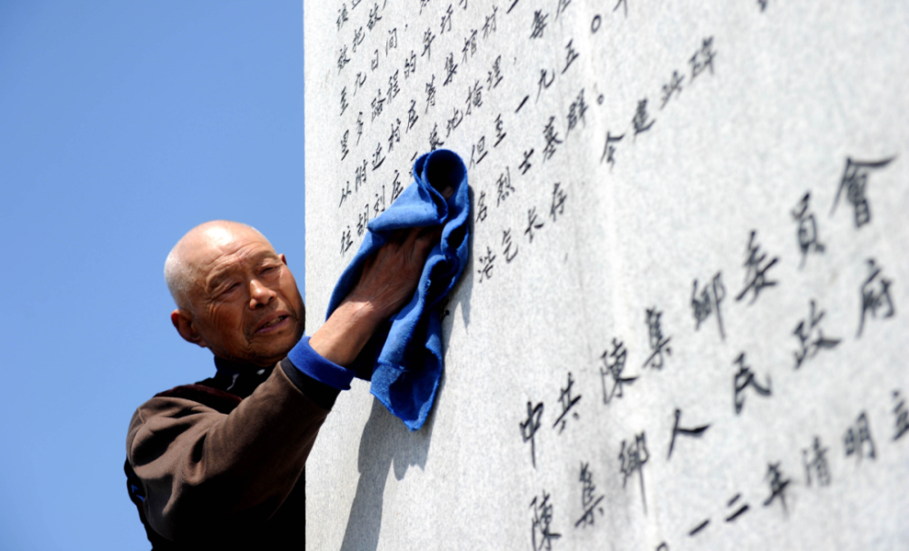 志愿者在烈士陵园擦拭无名烈士墓碑 刘军喜 摄