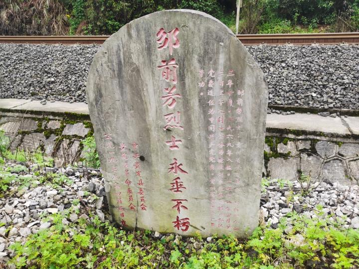 在邹前方牺牲的铁轨旁,贵定县立了一块“邹前方烈士永垂不朽”的纪念碑(2021年4月12日摄)。新华社记者 郑明鸿 摄