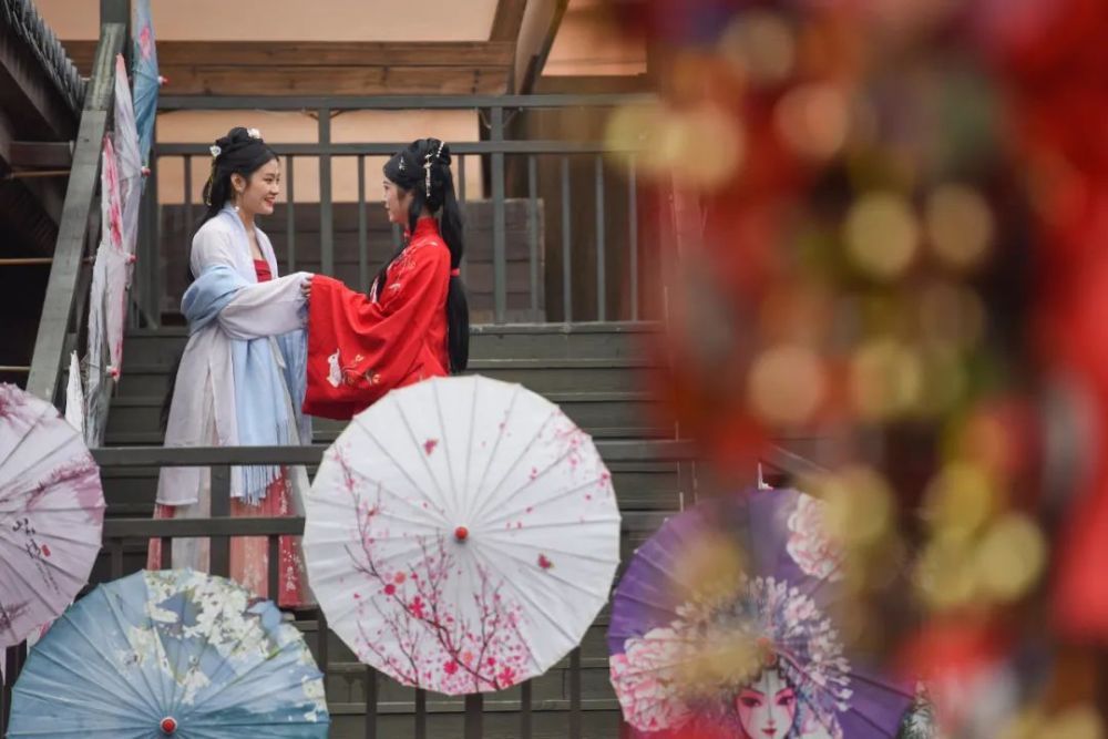 汉服爱好者在湖北荆州方特东方神画主题乐园游玩(图片来源 :视觉中国)