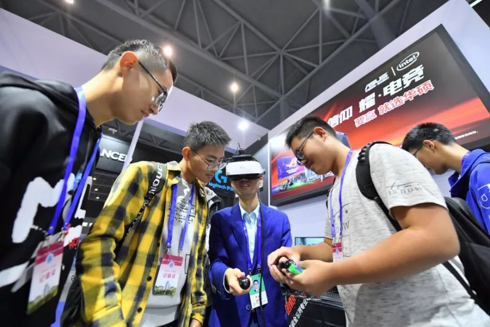 大学生在体验某品牌电竞装备。如今,电竞职业化发展成为必然趋势 ( 图片来源 :视觉中国 )