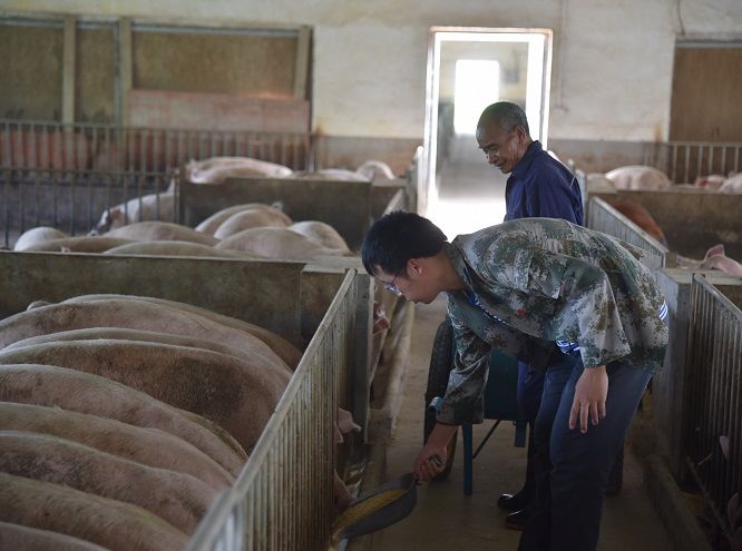 年轻村干部与村民一起投喂猪食 骆飞 摄