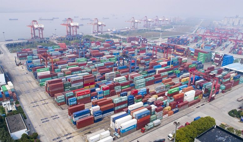 进行装载作业的武汉新港阳逻港集装箱码头 肖艺九 / 摄
