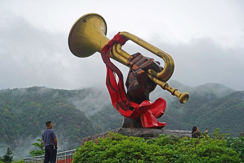 游客在井冈山参观“胜利的号角”雕塑 万象 摄