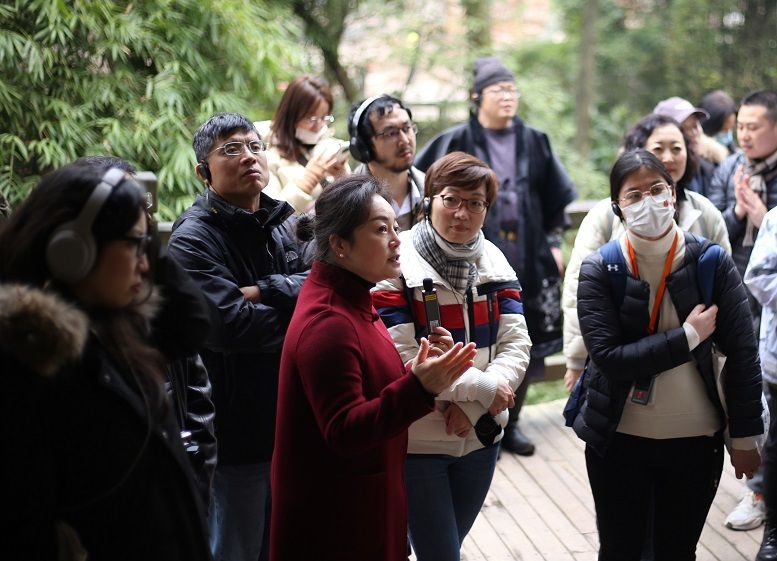 胡蓉(左三)在宝顶山景区向游客介绍石刻造像