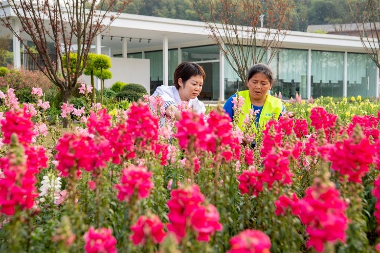 胡春梅(左)在花卉基地查看花卉生长情况 唐奕 摄