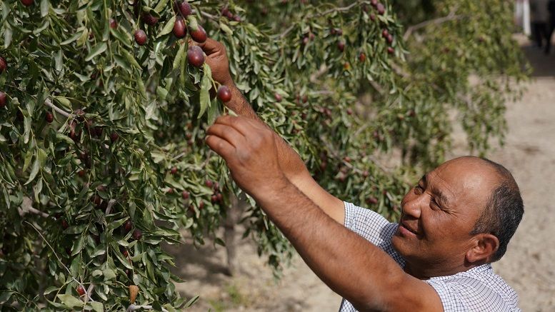 2021年 9月 27日,新疆喀什地区麦盖提县央塔克乡, 枣农艾买尔·开木白观察红枣长势 张啸诚 / 摄