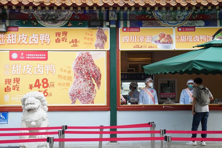6 月 4 日,在北京市朝阳区的眉州东坡酒楼团结湖店, 顾客在临街改建的外卖窗口购买食品 鞠焕宗 / 摄