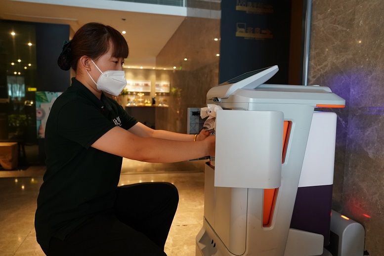 在秋果酒店亚运村国家会议中心店,工作人员将顾客订购的外卖放入服务机器人 任超 / 摄