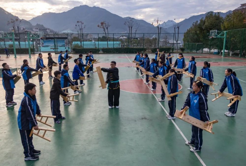 浙江省景宁县民族中学,老师指导学生练习畲族传统武术套路凳花 李肃人 摄