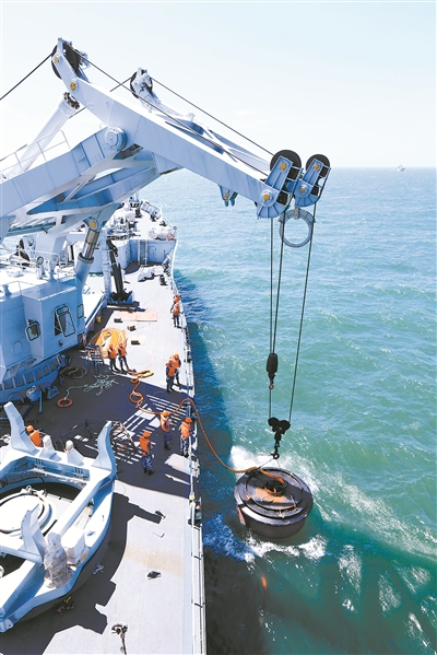 “吊放深潜救生艇!”在巨大的机械吊臂操纵下,深潜救生艇稳稳地放入水中,周边海面因气体释放而水花翻滚。旋即,深潜救生艇缓慢潜入水下,海面恢复平静。长岛号指挥所内,官兵表情严肃,聚精会神地盯着从水下传来的画面。