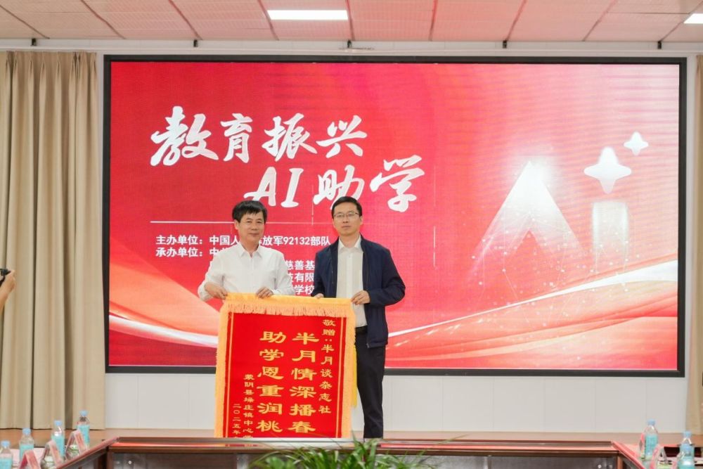 在揭牌环节,参会嘉宾共同为“人工智能教学示范教室”揭牌,见证蒙阴首所聚焦AI教育的示范校正式成立,并合影留念记录这一重要时刻。随后,垛庄镇中心学校向参与捐赠的各单位敬赠锦旗。