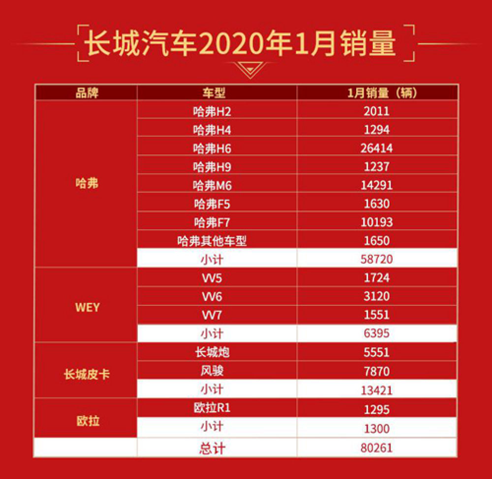 春节假期提前,给本已进入“寒冬”的国内车市“雪上加霜”。在此情况下,1月,长城汽车销售新车80261辆。其中,哈弗、WEY、欧拉、长城皮卡分别销售58.720辆、6.395辆、1.300辆和13.421辆,出口销量同比劲增18.36%,达4.442辆。