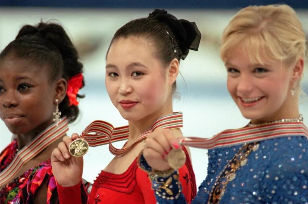 1995年世界花样滑冰锦标赛,陈露(中)夺冠。新华社发