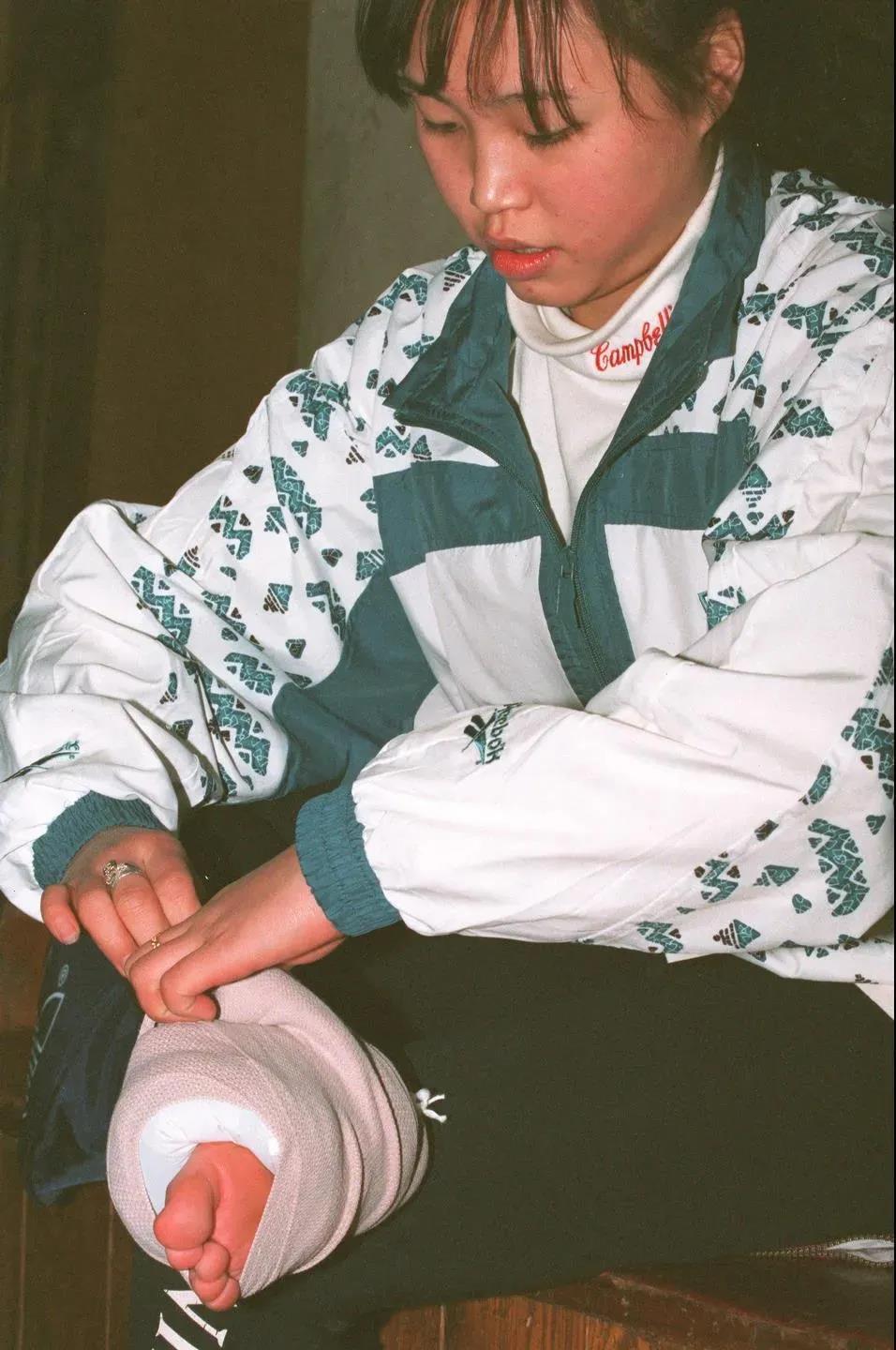 1996年1月8日,中国冰上项目选手加紧亚冬会前强化训练,陈露在做上冰前准备。新华社发