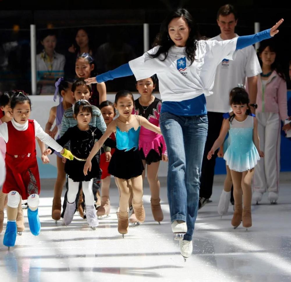 2007年4月24日,陈露在北京举行的俄罗斯索契2014申奥宣传活动中为小朋友进行花样滑冰指导。新华社发