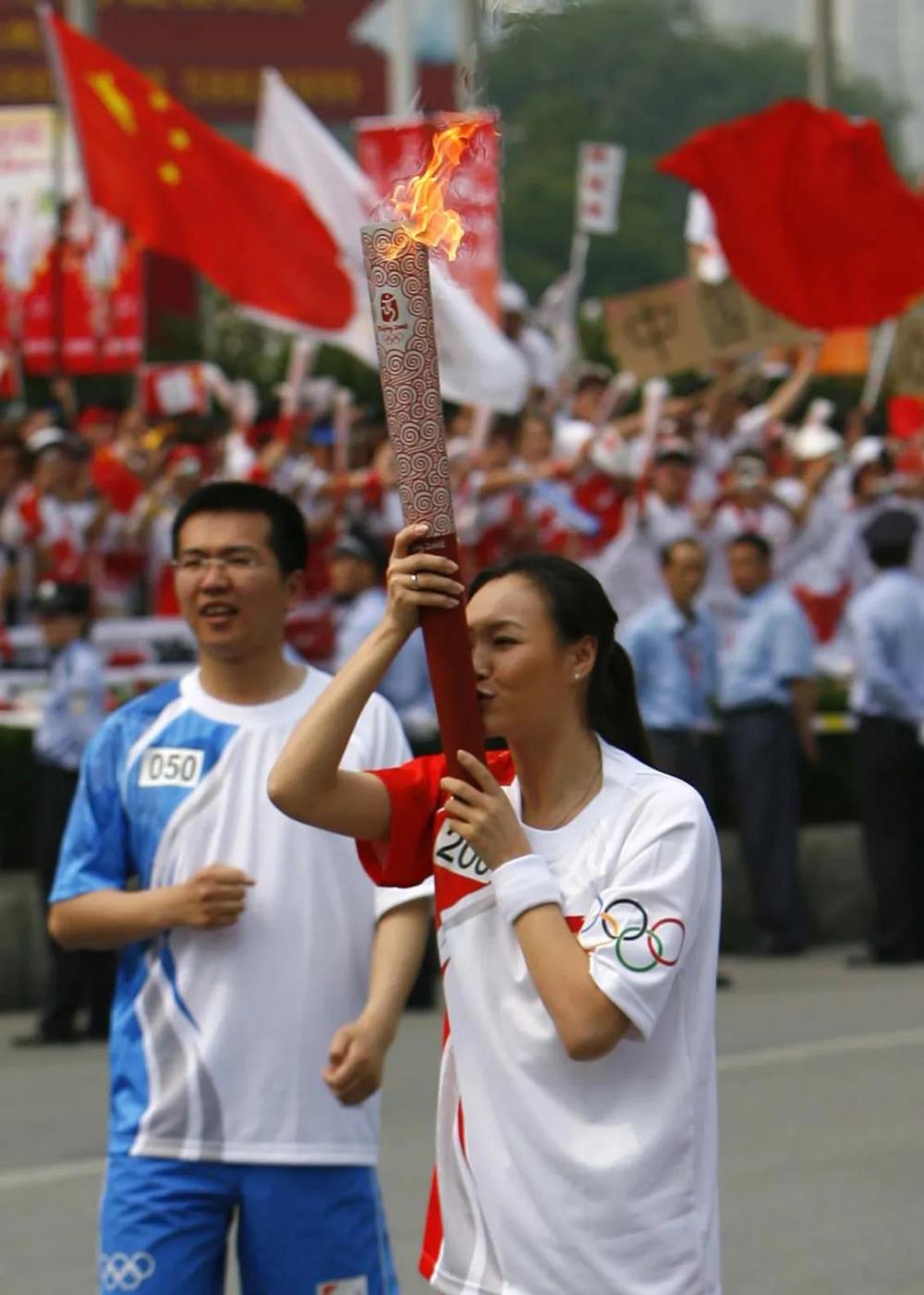 2008年5月23日,火炬手陈露在传递过程中亲吻火炬。新华社发