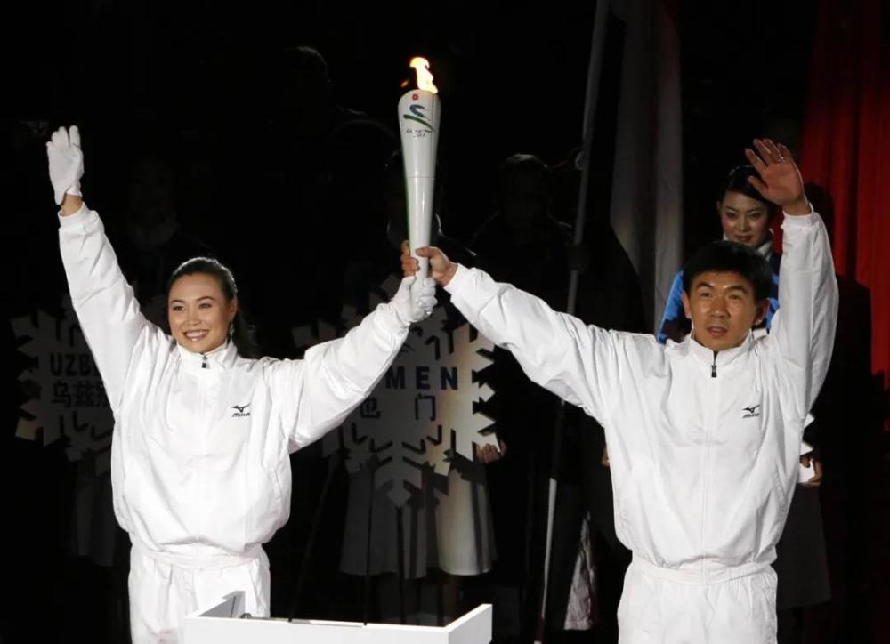 2007年1月28日,第六届亚洲冬季运动会开幕式,短道速滑前世界冠军李佳军从陈露手中接过火炬。新华社发